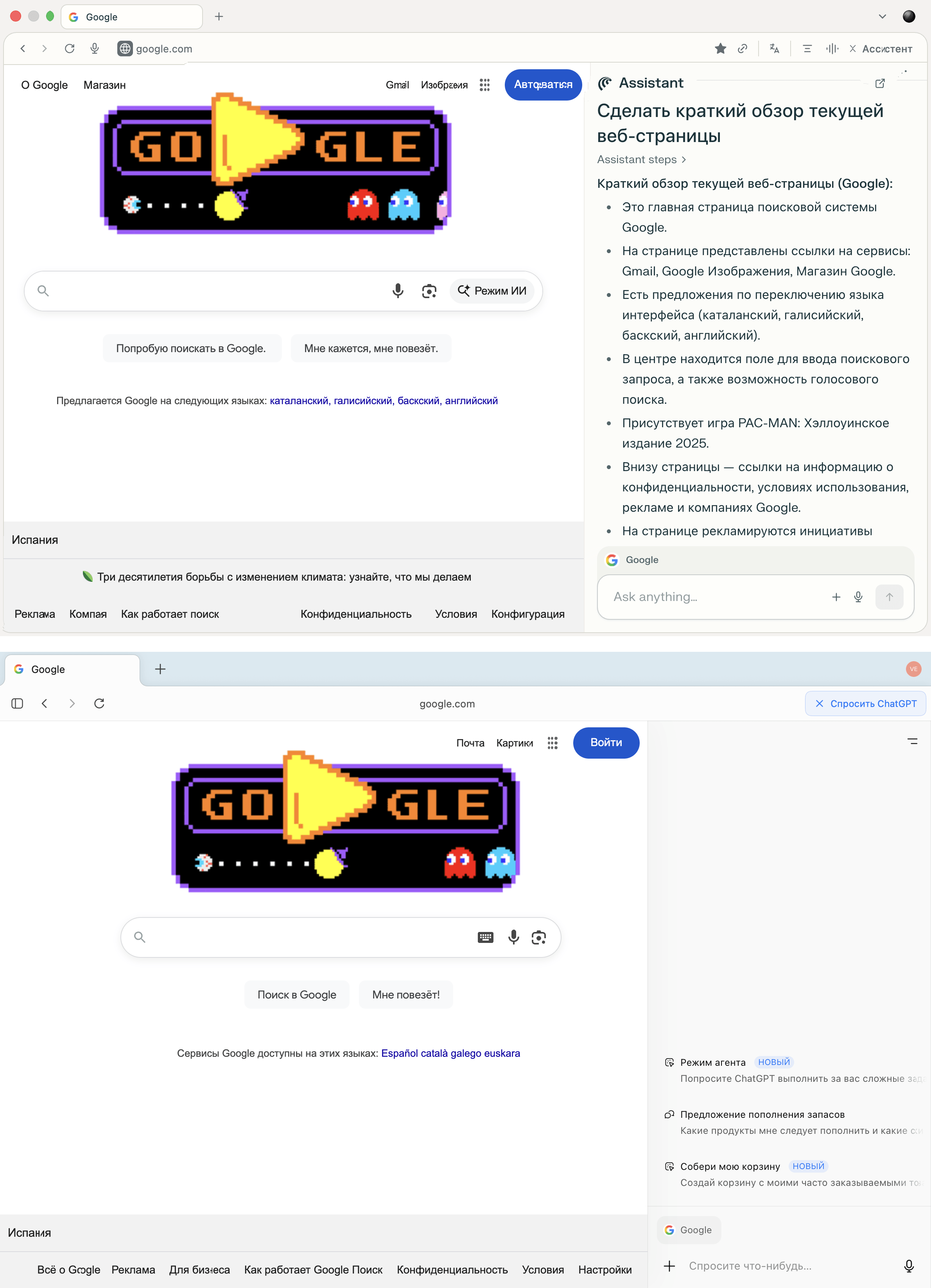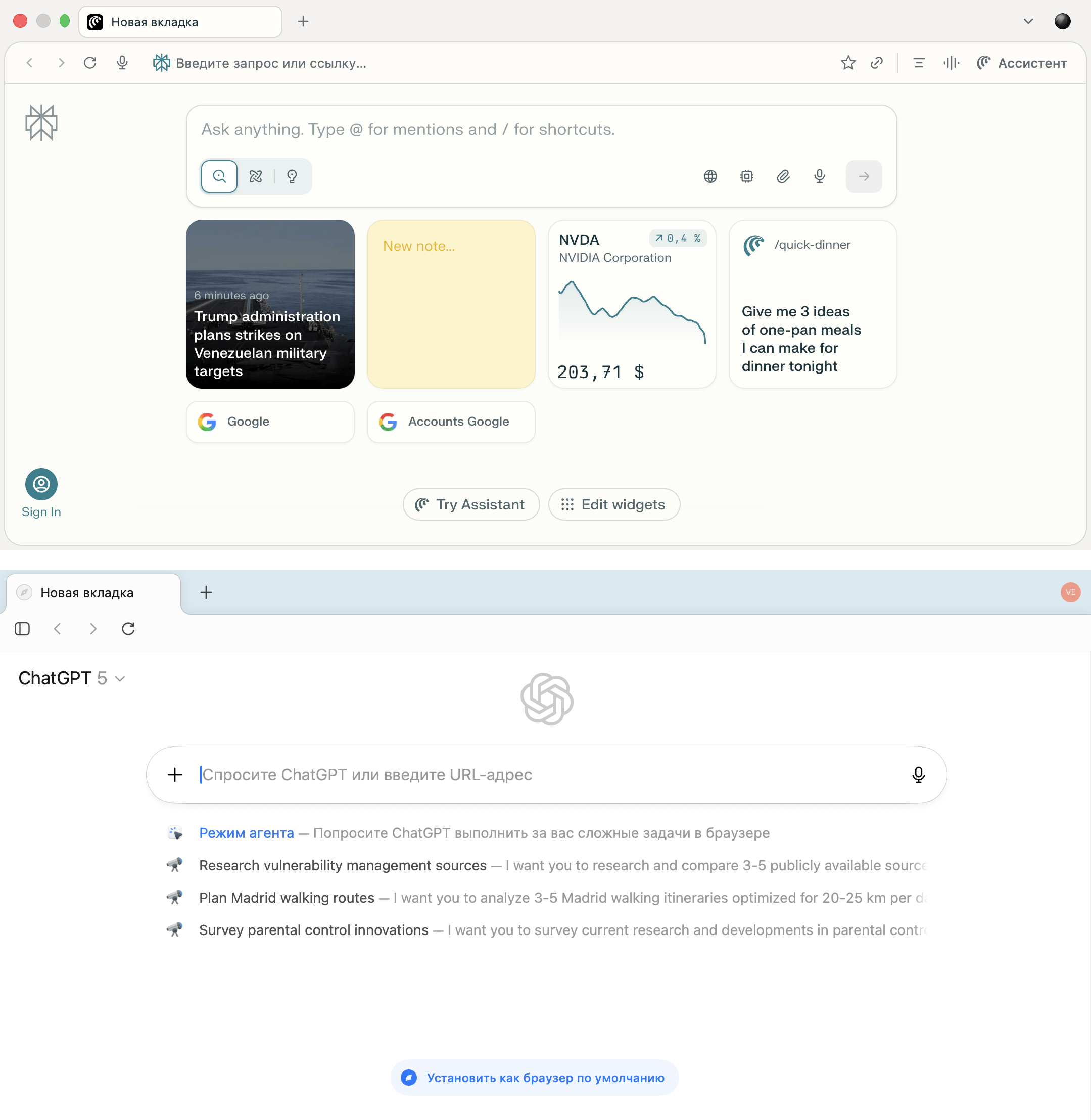Главные экраны Comet (Perplexity AI) и Atlas (OpenAI) демонстрируют схожую концепцию: минималистичный интерфейс с центральной строкой ввода и встроенным ИИ, который становится основным способом взаимодействия с вебом