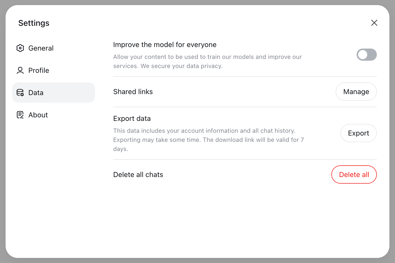 Для перехода в настройки управления данными нужно открыть левую боковую панель, нажать на три точки рядом с вашим именем в ее нижней части, выбрать Settings, а затем в открывшемся окне перейти на вкладку Data. Отключите функцию Improve the model for everyone — это снизит вероятность того, что ваши диалоги с DeepSeek окажутся в его тренировочных датасетах. Если же вы хотите, чтобы модель перестала учиться на тех данных, которыми вы с ней поделились еще до отключения этой функции, придется написать на privacy@deepseek.com и указать конкретные данные или переписки.