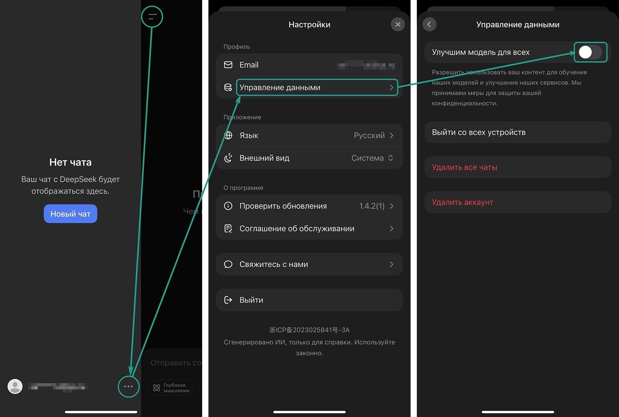 В мобильном приложении DeepSeek также открываем левую боковую панель, нажимаем на три точки рядом с вашим именем в ее нижней части и попадаем в Настройки. Заходим в раздел Управление данными и отключаем функцию Улучшим модель для всех.