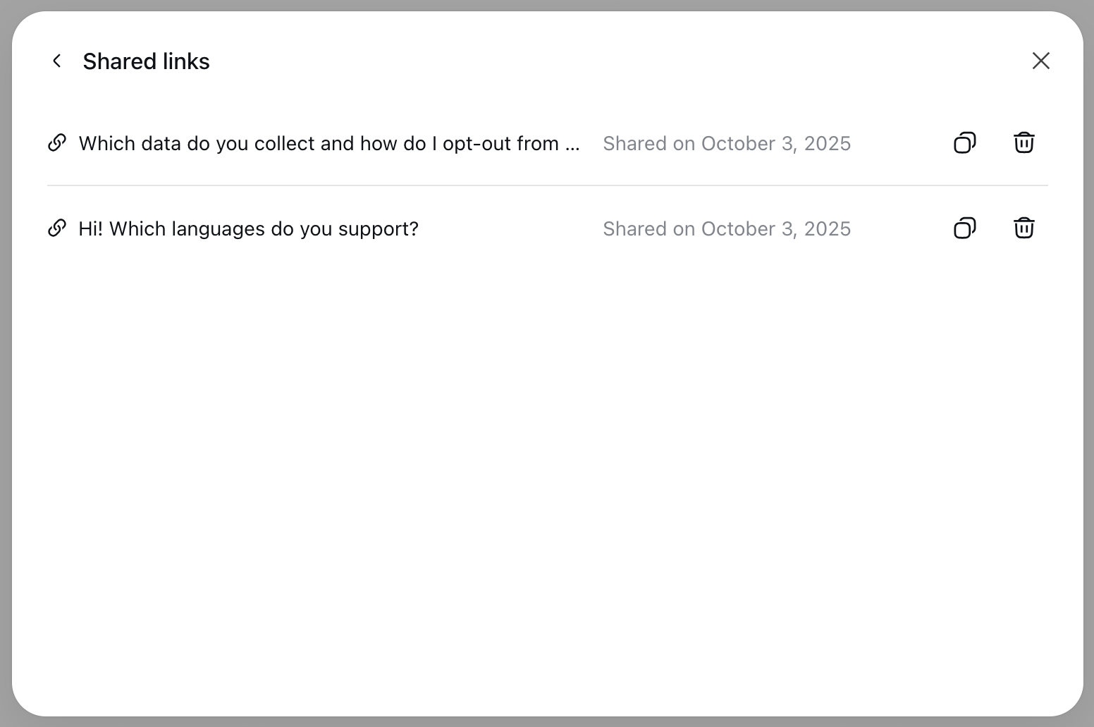 Вы можете просмотреть все «расшаренные» вами чаты и при необходимости удалить публичные ссылки на них в веб-версии, зайдя в Settings → Data → Shared links → Manage.
