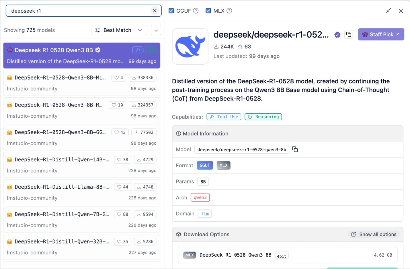 Самый простой способ установить DeepSeek локально — через приложение LM Studio. Оно позволяет работать с моделями в офлайне и не собирает никакую информацию из переписок с нейросетями. Скачиваем приложение, нажимаем на значок поиска и ищем нужную вам модель. Скорее всего, приложение предложит много разных версий одной и той же модели.