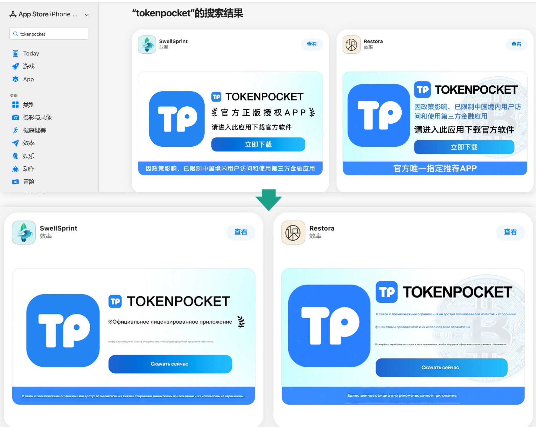 Баннеры на страницах приложений, заявляющих, что с их помощью можно скачать официальную версию приложения TokenPocket, отсутствующую в локальном App Store