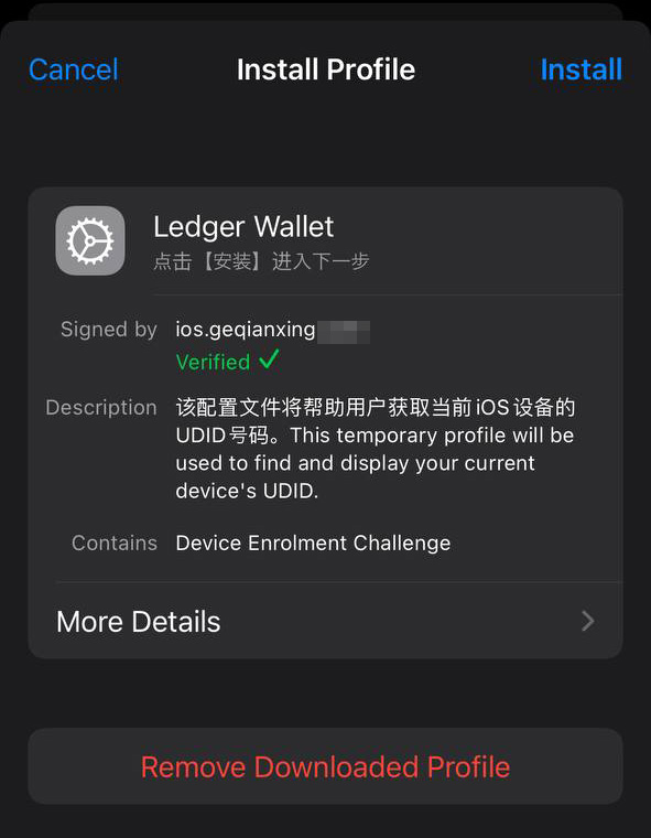Для установки приложения жертва должна сначала установить профиль конфигурации, который позволит загрузить на ее устройство вредонос в обход App Store. Обратите внимание на зеленую галочку верификации