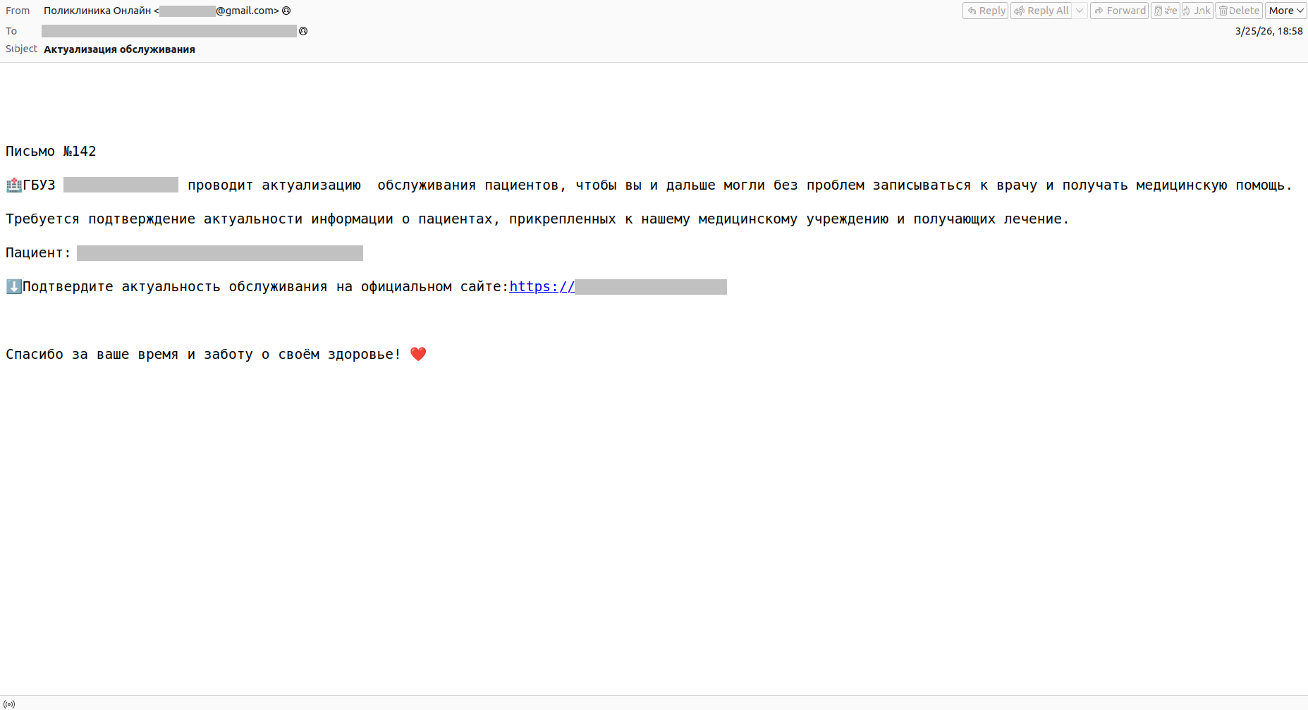 Но медицинская тематика интересует не только хакеров — ее активно используют спамеры и мошенники. Они предлагают «медицинские услуги» с подозрительно выгодными условиями, рассылают письма про изменения условий медицинского страхования, рассказывают про «древние гималайские лечебные традиции». Естественно, все присылаемые ссылки ведут на подозрительные сайты, предлагающие сомнительные товары или услуги.